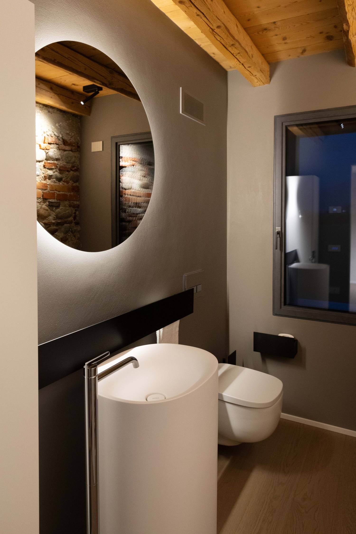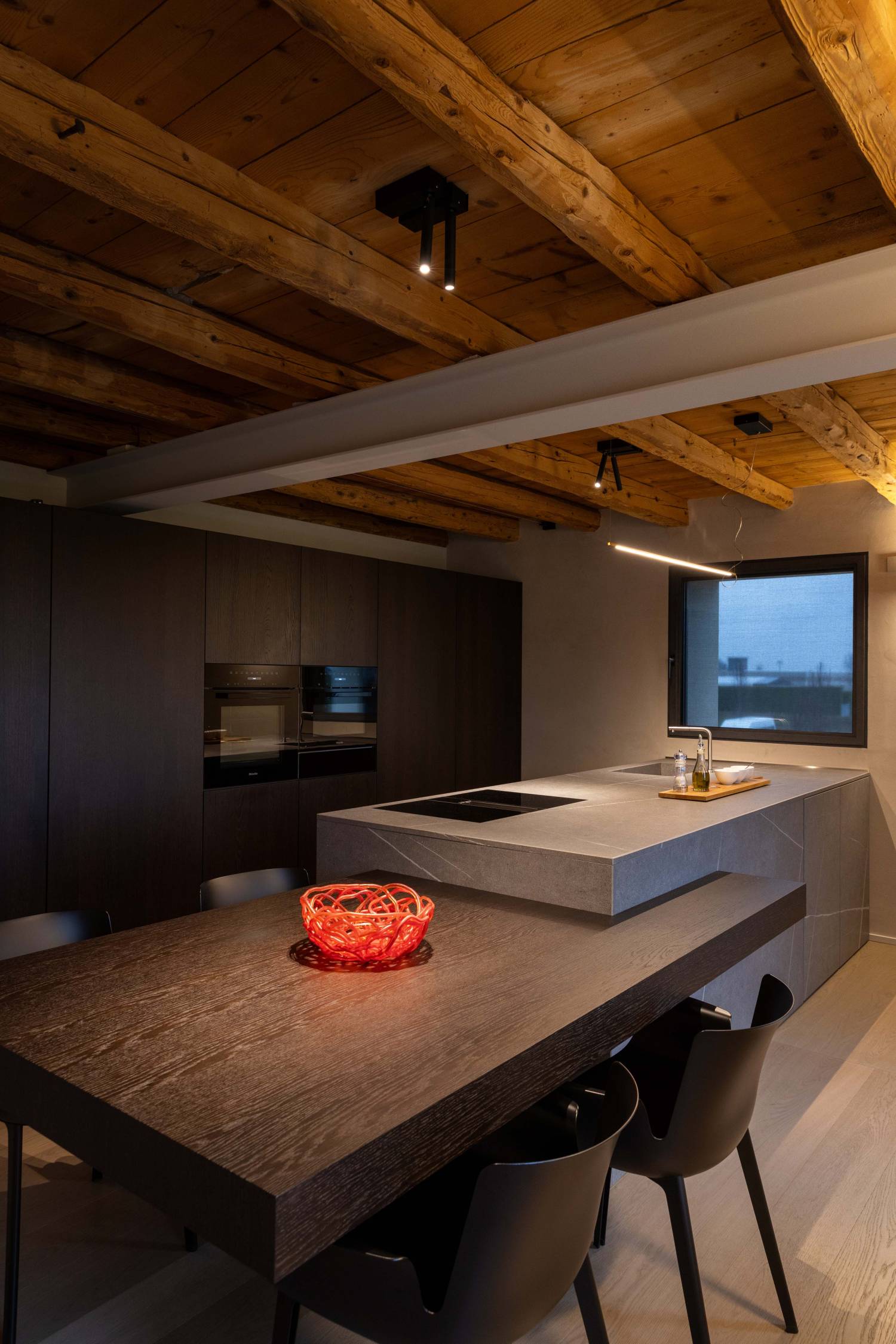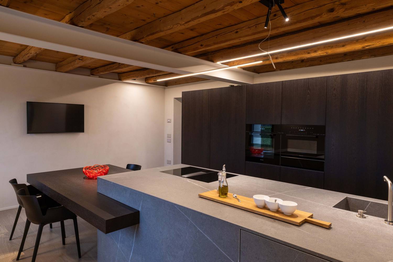 L’intervento ha voluto mantenere viva la memoria del luogo, conservando la semplicità originaria e reinterpretandola con materiali contemporanei e linee essenziali. Legno, pietra e superfici materiche dialogano con elementi metallici e arredi d’autore, dando vita a un equilibrio tra calore domestico e purezza formale.